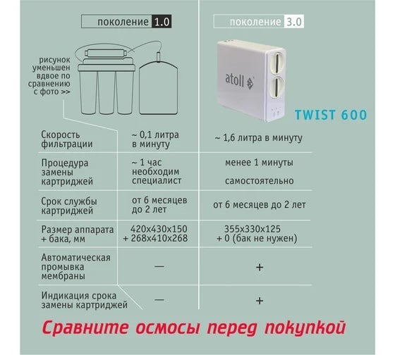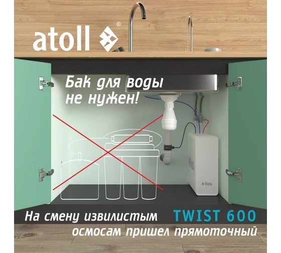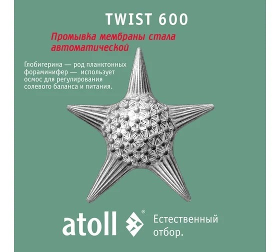 Обратноосмотическая мембрана atoll TWIST RO-600 удаляет самые незаметные, но самые вредные типы загрязнений, такие как вирусы, тяжёлые металлы, растворенные соли, включая жёсткость и делает воду по-настоящему вкусной,безопасной и полезной. Добавленный в мембрану антискалант продлевает её срок службы.