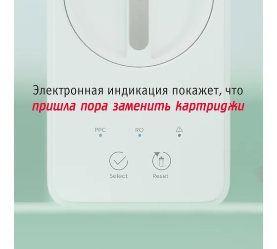 Встроенный Smart процессор — управляет всеми режимами работы фильтра: отслеживает оставшийся ресурс, напоминает о необходимости замены картриджей, периодически отправляет команду на промывку мембраны свежей водой.