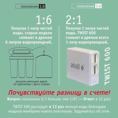 Обратноосмотическая мембрана atoll TWIST RO-600 удаляет самые незаметные, но самые вредные типы загрязнений, такие как вирусы, тяжёлые металлы, растворенные соли, включая жёсткость и делает воду по-настоящему вкусной,безопасной и полезной. Добавленный в мембрану антискалант продлевает её срок службы.
