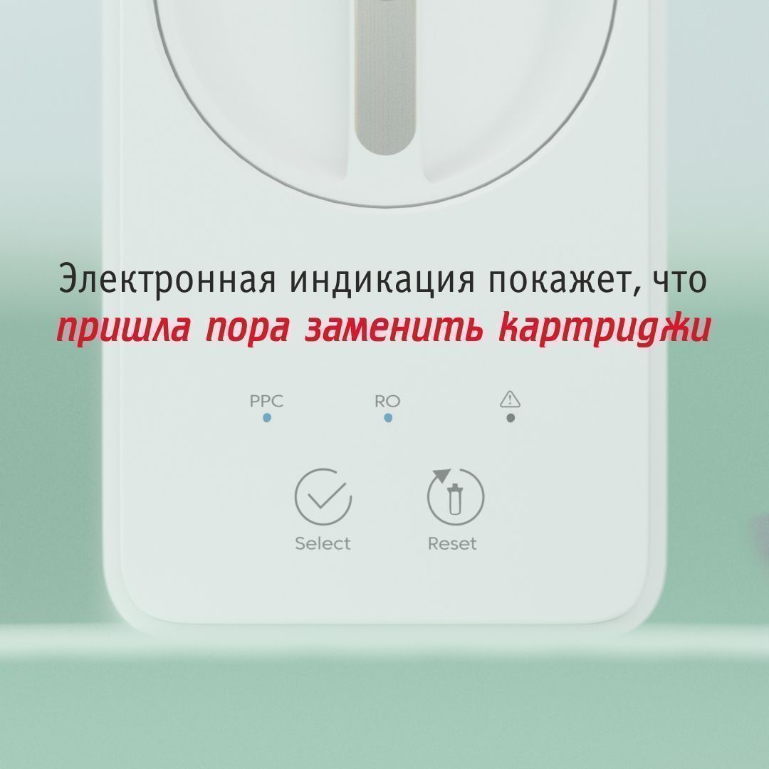 Встроенный Smart процессор — управляет всеми режимами работы фильтра: отслеживает оставшийся ресурс, напоминает о необходимости замены картриджей, периодически отправляет команду на промывку мембраны свежей водой.