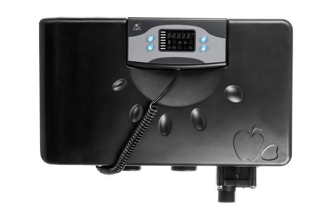 Один корпус находится в режиме работы, другой в режиме регенерации или ожидания. Клапан управляется электронным контроллером с LED дисплеем, имеет встроенный расходомер. В данном клапане реализована возможность проведения нисходящей и восходящей регенерации.